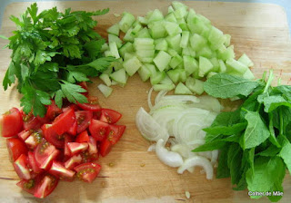 Numa liquidificadora, juntar o alho com o azeite, o sumo de limão, o sal e a pimenta e bater bem até fazer um molho. Quando a quinoa estiver quase fria, juntar o pepino, os tomates, a salsa, a hortelã e as cebolas e regar com o molho. Está pronto a servir! Fiz uma salada de alface cá da horta para acompanhar.