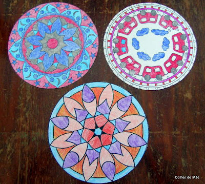 Houve uma época em que as mandalas faziam parte dos passatempos dos miúdos cá de casa. Tinhamos uma prateleira da sala, juntamente com os lápis de côr, canetas de feltro e aguarelas, onde guardávamos as mandalas impressas, e sempre que lhes apetecia pintar uma mandala, ali estava ela prontinha!